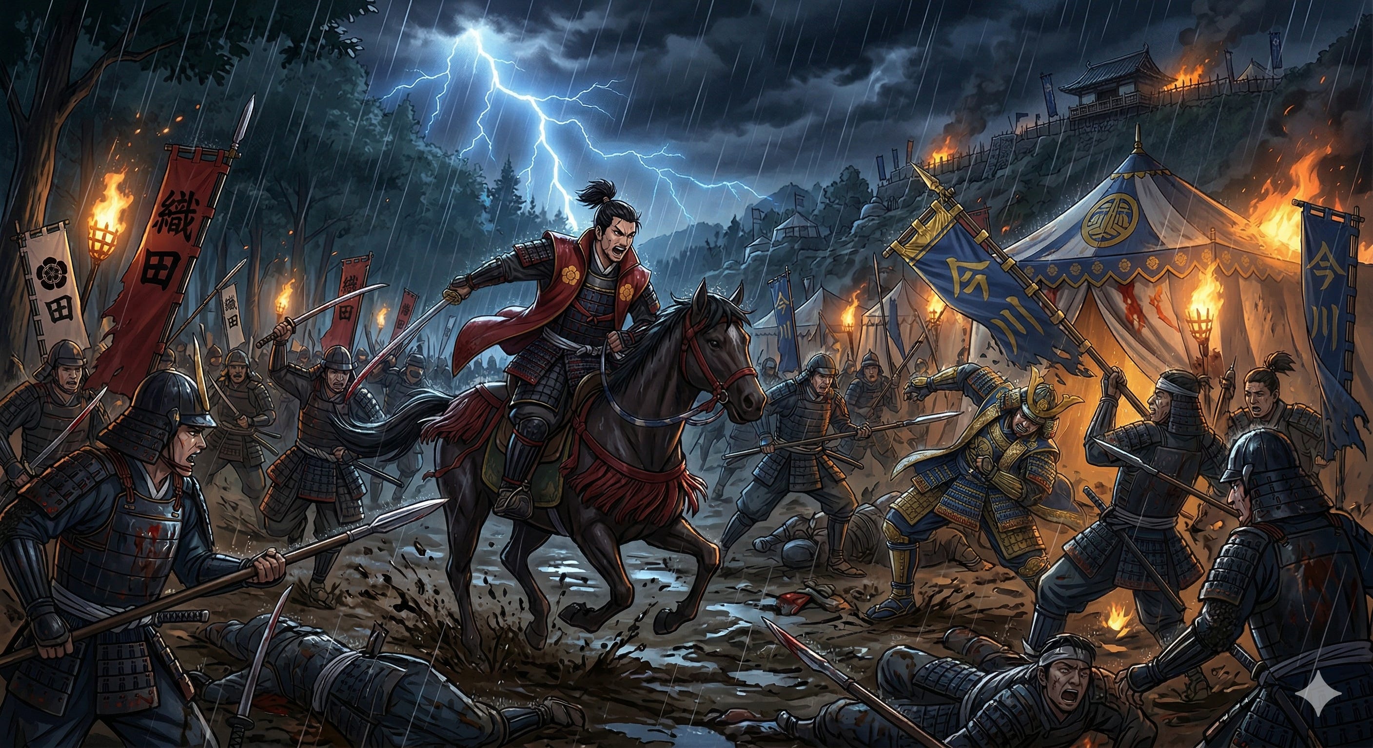 Oda Nobunaga, al que Yoshimoto calificaba despectivamente como el “tonto de Owari”, reclutó una fuerza de élite de apenas 3.000 hombres. En plena noche, en mitad de una tormenta torrencial, aprovechó su conocimiento del terreno y logró acercarse al campamento principal de Yoshimoto sin ser visto.